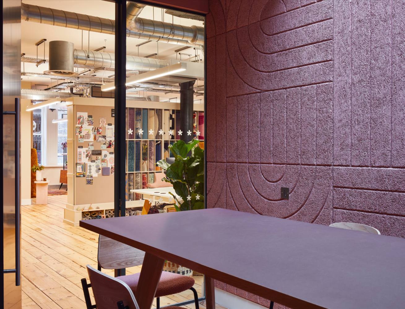 Using clever configuration, a sense of space is created in a relatively modest floorplan. In social areas, an inviting cream boucle sofa from SoHo Home creates a cosy living-room style seating arrangement, matched with vintage armchairs and a teak mid-century divider from Vinterior. “Trifle* now have a new home which lives and breathes our values and business,” comments Emma Morley, founder and creative director at Trifle*, “a space that allows us to co-create with clients and partners, and collaborate.”