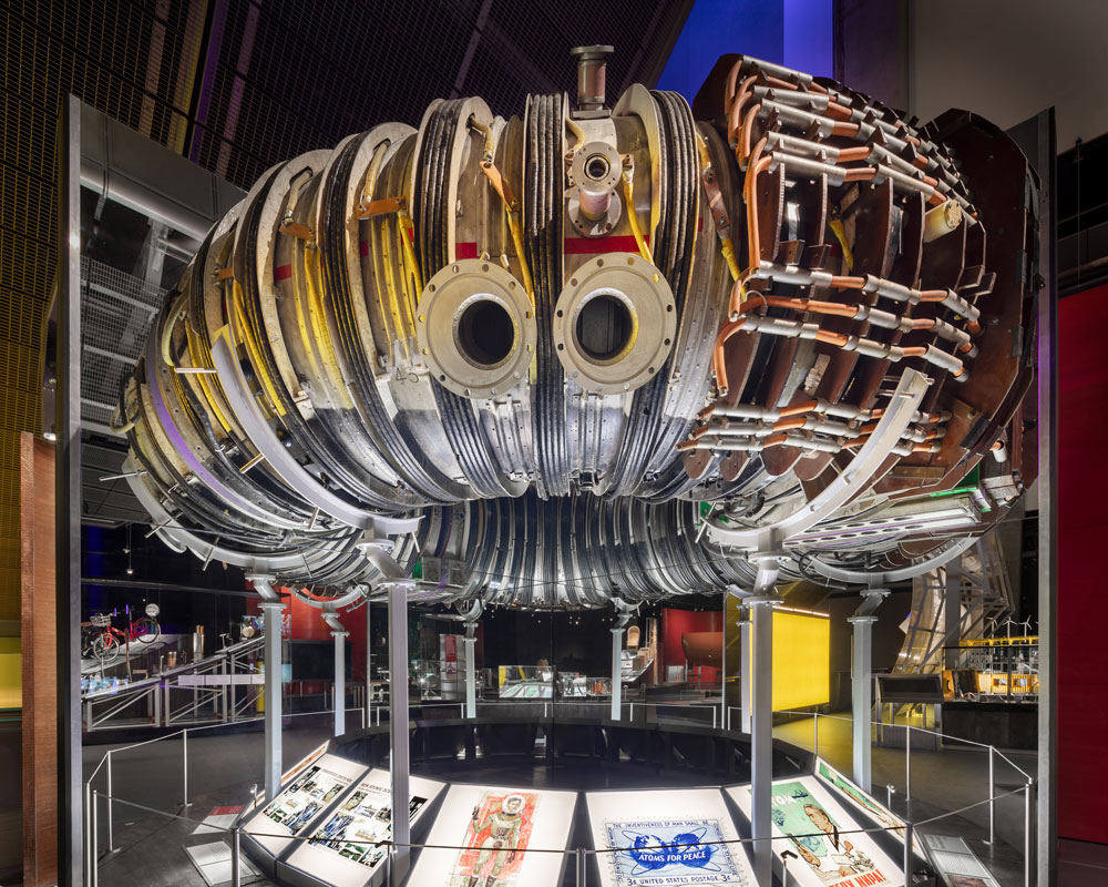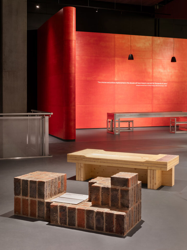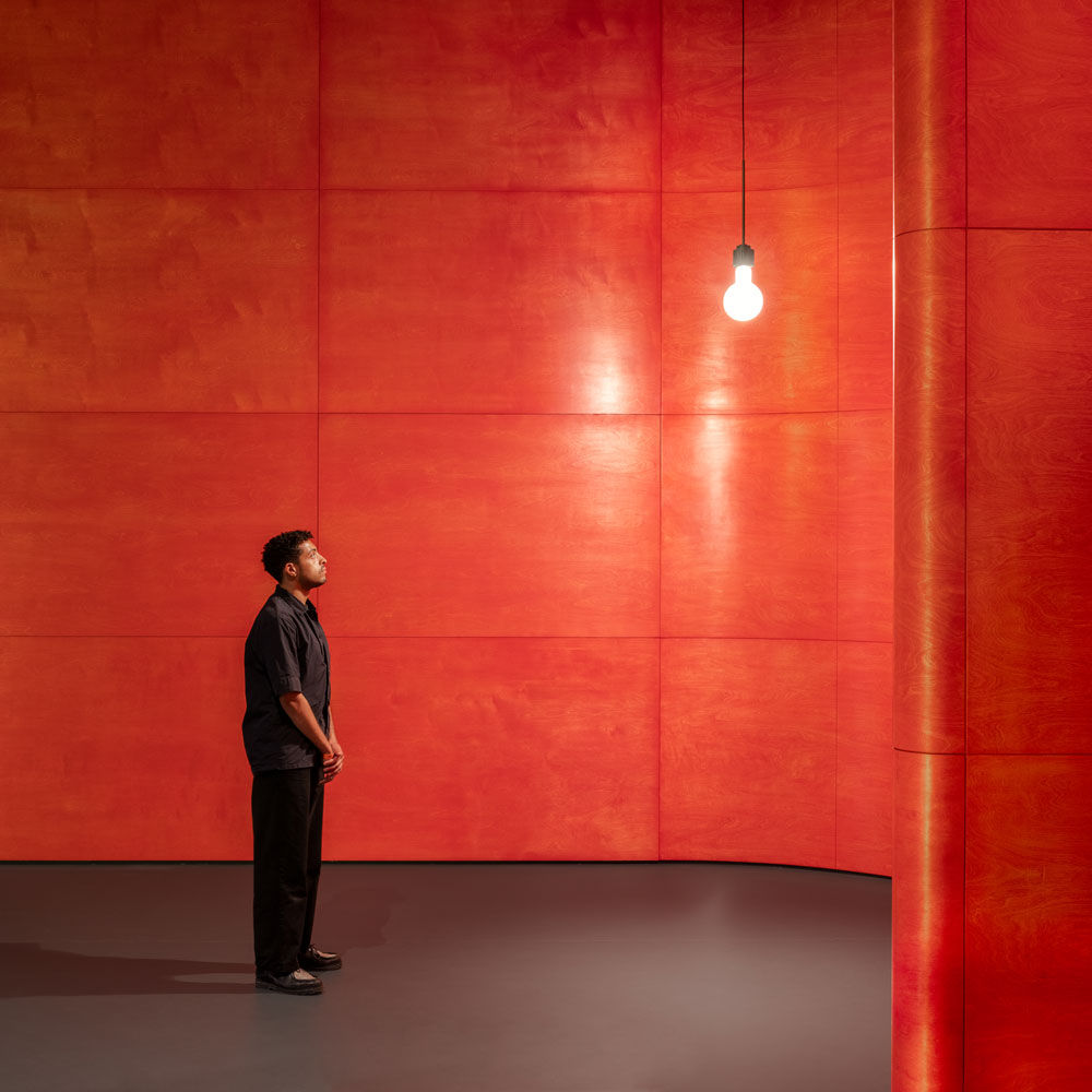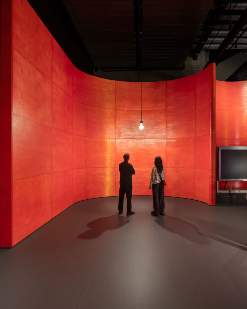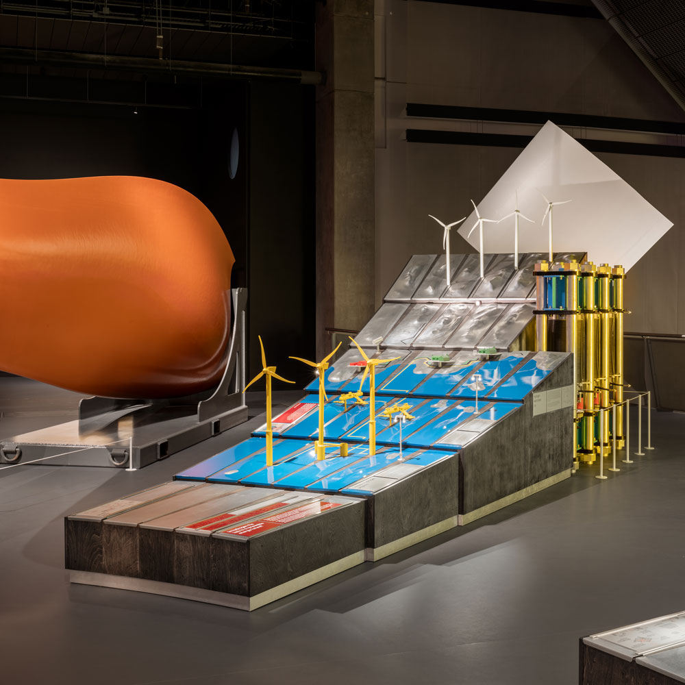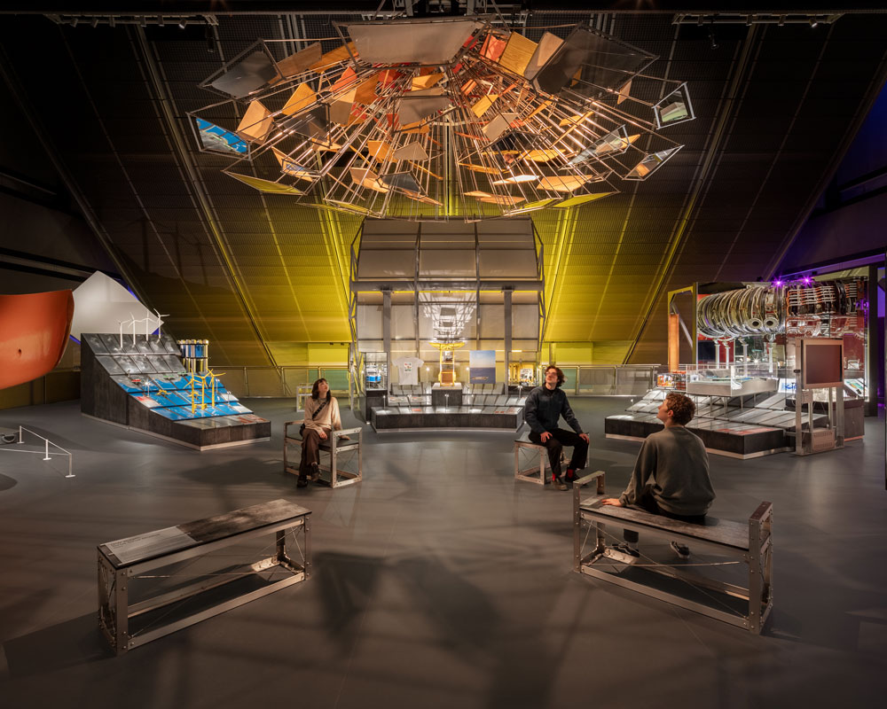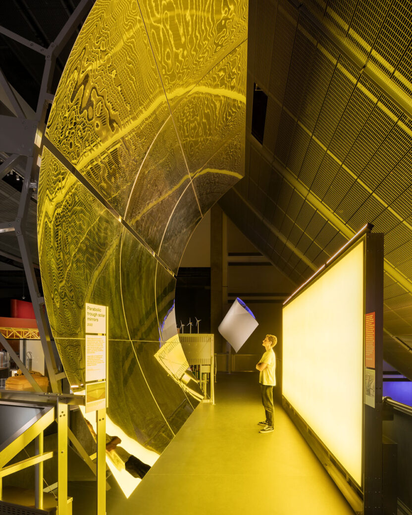 Tall, curved walls of stained red marine plywood sit at both the entrance and exit of the gallery, while each of the display plinths have been arranged to point towards a central core: here, visitors can experience a kinetic sculpture, Only Breath, created by artists Alexandra Carr and Colin Rennie from Torus Torus Studios. Interactivity is encouraged throughout, starting with a ‘candle moment’ at the entrance (a lone, pulsating lightbulb reminding us of our essential need for energy) to an imposing, full-height solar mirror previously used as a parabolic reflector trough. Each striking exhibit is therefore designed to encourage meaningful conversations and spark curiosity, as well emphasise the need for the collective action needed to achieve a sustainable future.