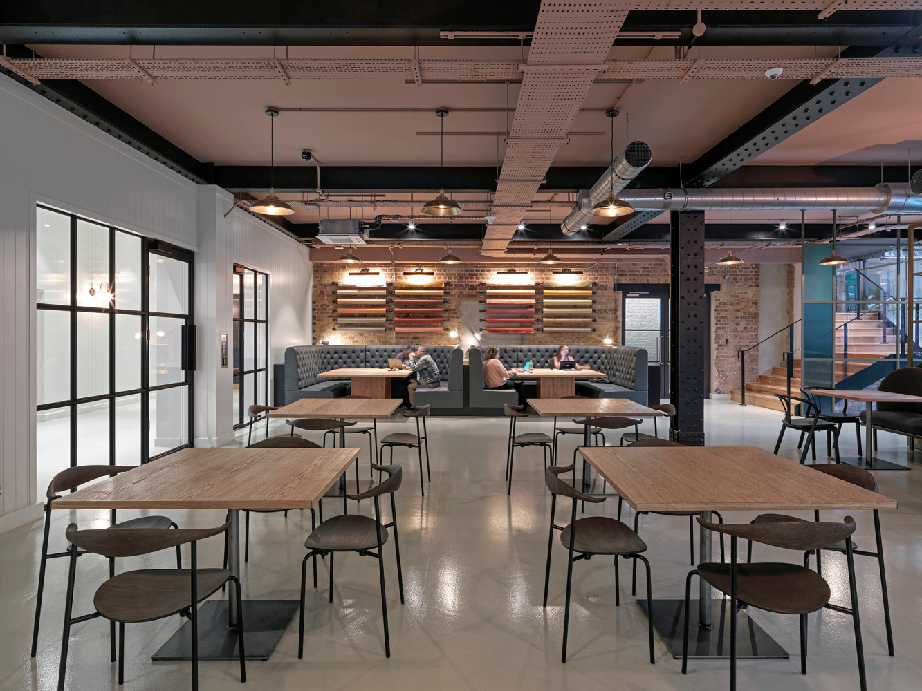 Based just off Chiswick’s high street, the rich heritage of Barley Mow Centre sits close to the design concept. As the former home of Sanderson Wallpaper factory – a family business that dates back to the 19th century – and one of the UK’s first shared office spaces, Bluebottle retained historical accents while avoiding anything ‘kitsch’. The studio stripped the style of the building back to its original design by exposing ceilings, sandblasting walls and adding industrial features such as lighting and Crittall windows painted in black.