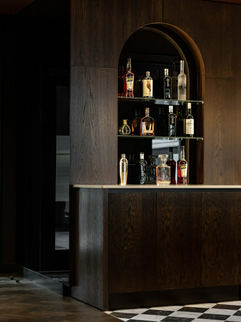 Women-only members’ club Chief’s first international location occupies a historic townhouse with event spaces, meeting rooms, workspaces and a bar. Designed by Chief’s all-female team in collaboration with design studio Thirdway, the clubhouse’s design mixes the ‘home-from home’ style of the US venues while also delivering a sense of place through London-specific details. The Grade I listed townhouse connects to a four-story mews by way of a central glazed link, and the building’s original features and setting have influenced the clubhouse’s design. Members are greeted by a dark wooden reception desk, inspired by the arches and curved glass of the townhouse, mixed with the linear panelling features and groove detailing in the fireplaces.