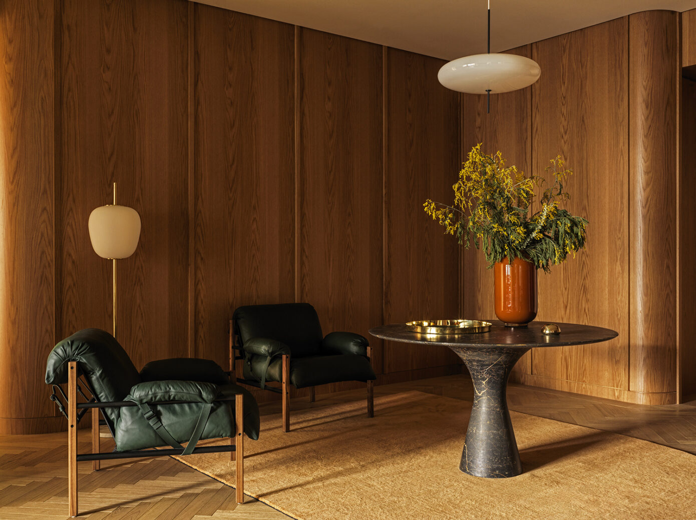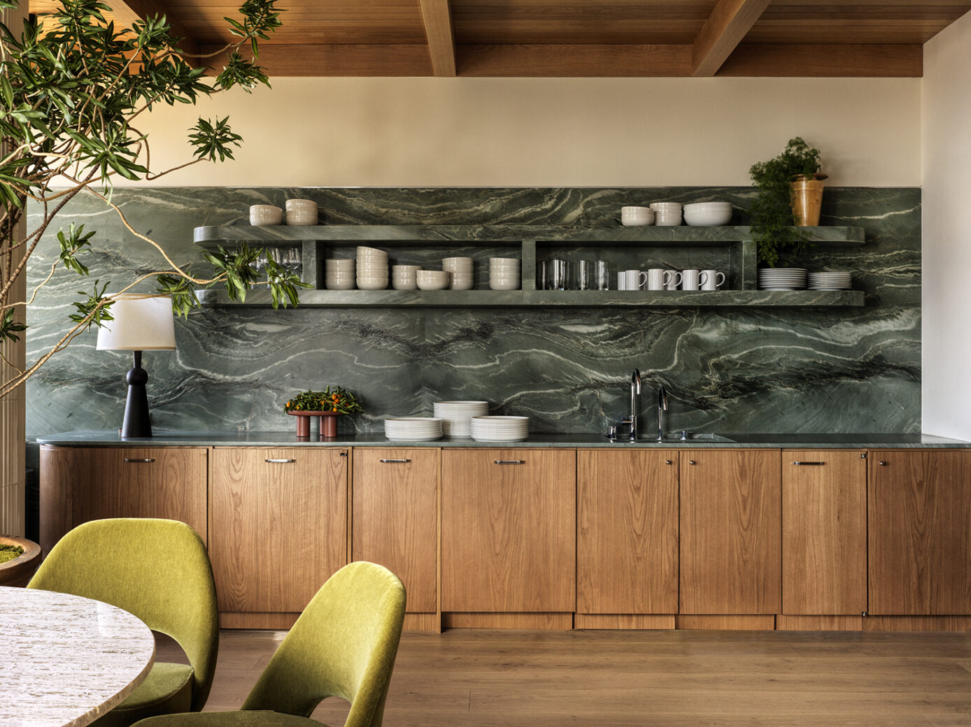 Nodding to the lifestyles of both overseas and local residents, a base palette of greens is inspired by the East-Asian matcha latte; popular for its healthy but comforting connotations. A marbled floor tile simulates the stirring of milk into the smooth hot drink and the ceiling is painted a cool shade of matcha green. Bespoke honey-toned timber furniture is used throughout for its stabilising effect and complemented by a brown textured wallpaper to create warmth.