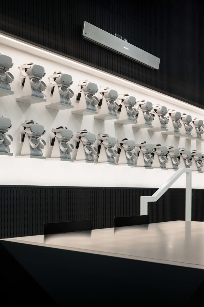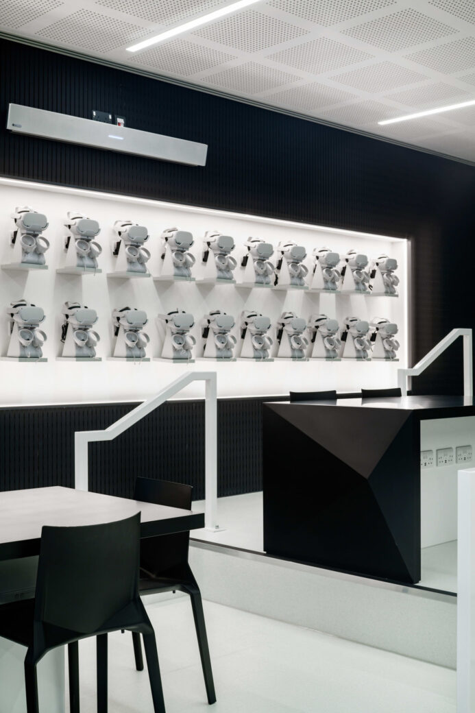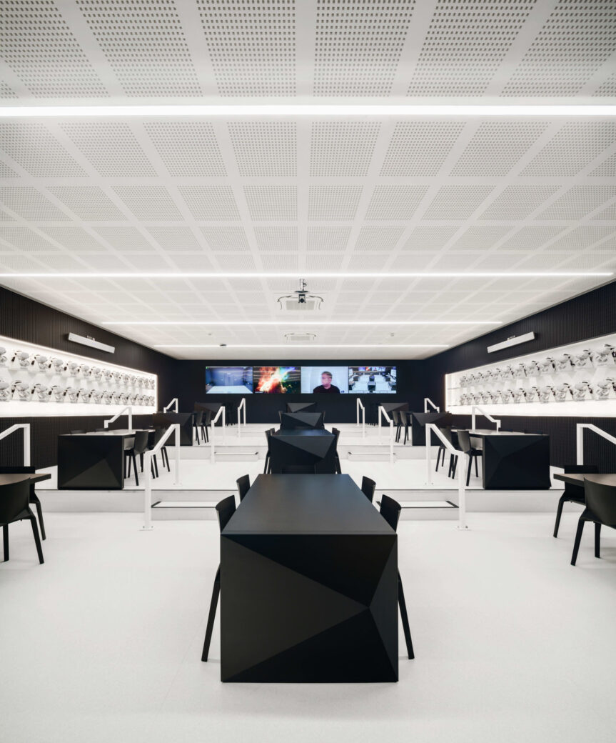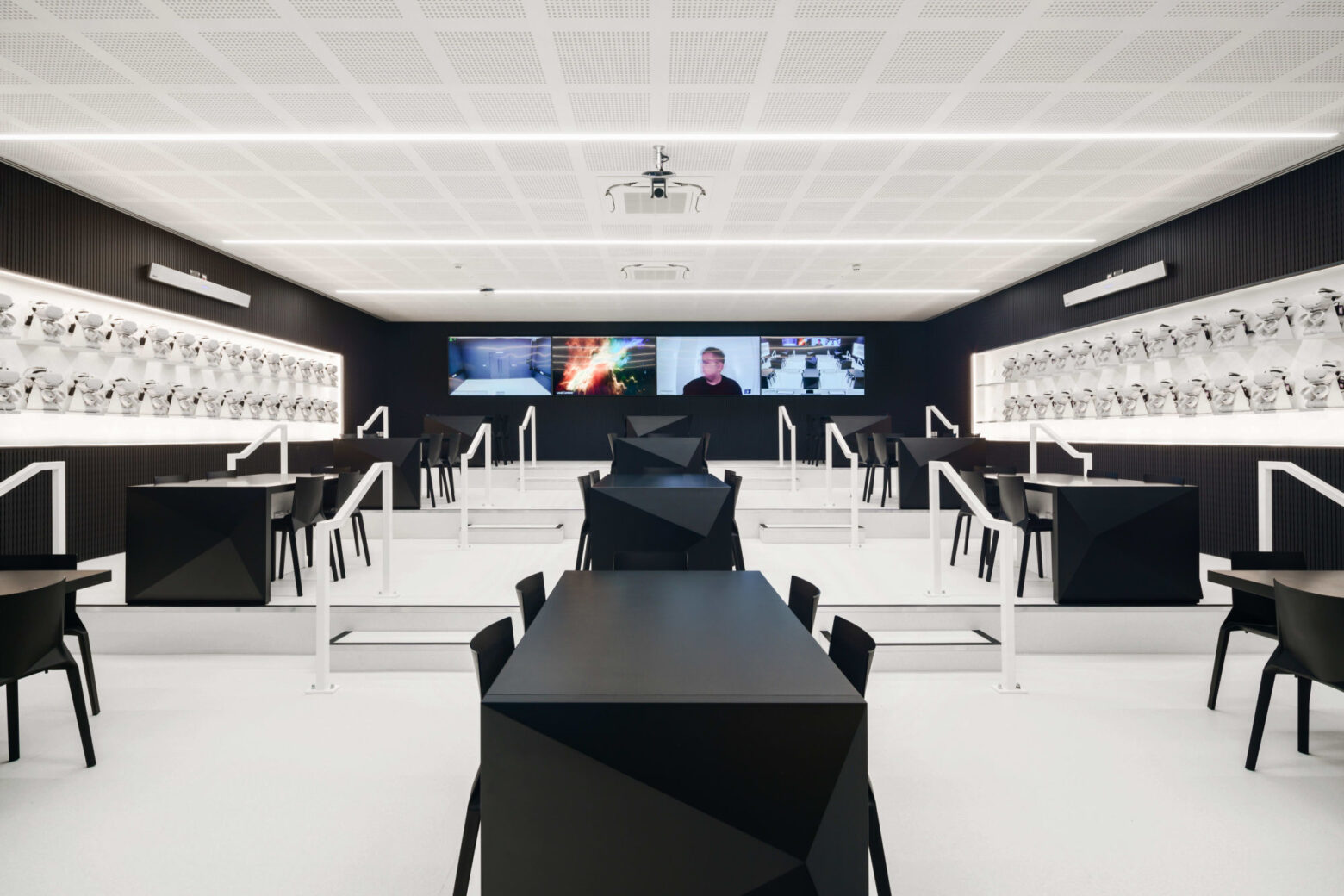The exterior is finished with a high-spec, sustainable luxury polished plaster by Armourcoat that complements the future-facing tech inside. “The architecture embodies the function of the building,” comments WindsorPatania’s Giovanni Patania, “creating a connection with virtual environments while inspiring the next generation of students.”