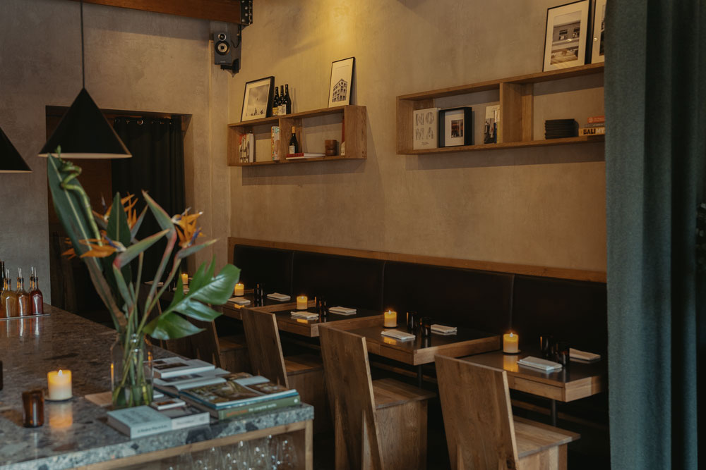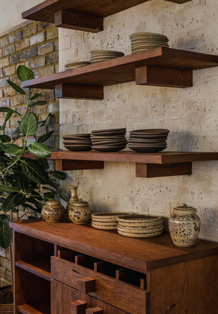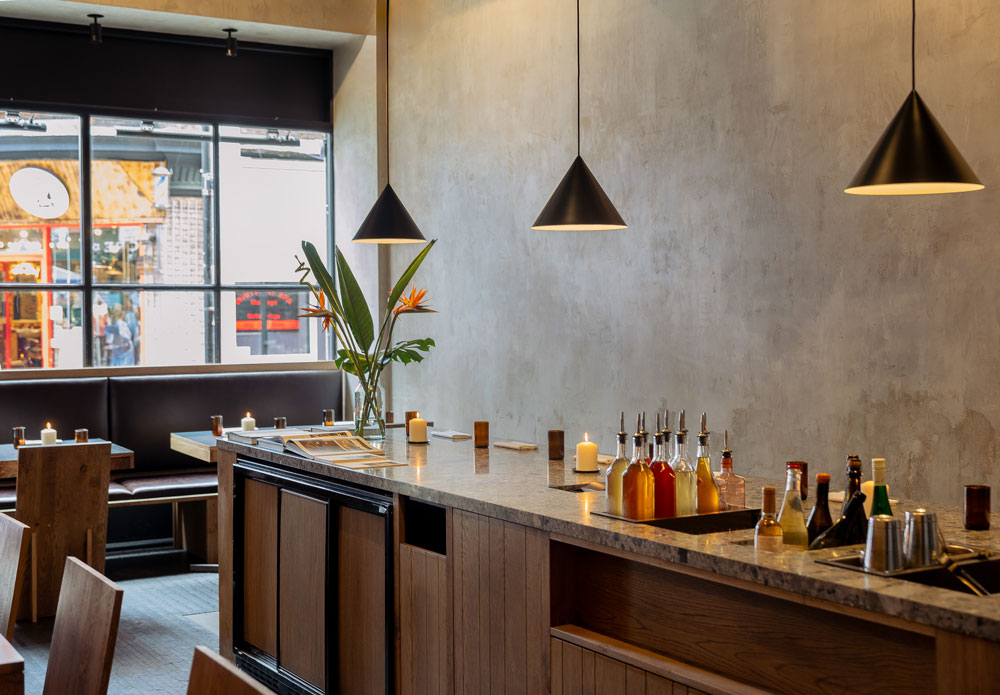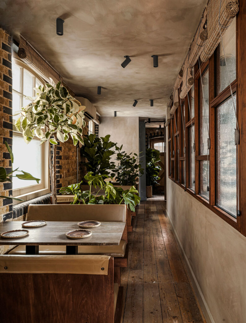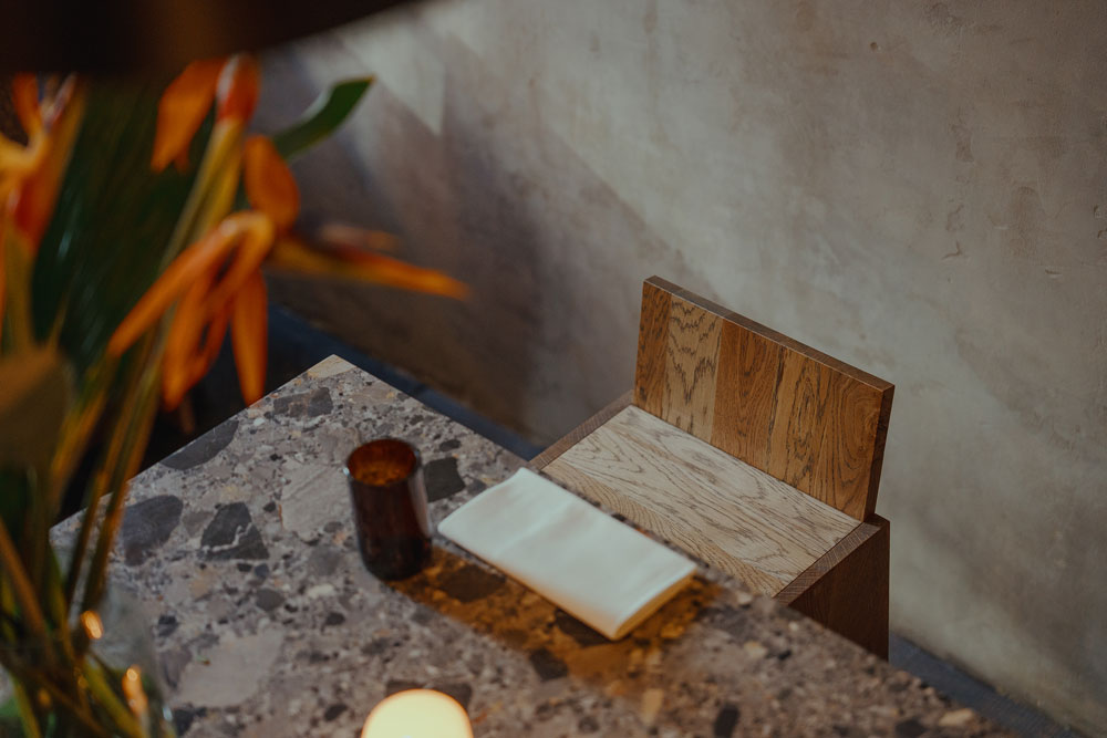 Cement floors, exposed brickwork and limewashed plaster in warm tones provide a blank canvas for the decor and furniture, all of which was designed by A-nrd Studio. The oak used to craft all the custom furniture and fixtures at Kolae is hand-planed, a traditional technique chosen by the studio to add texture and character into the wood, completed in close collaboration with skilled joiners from the north of England.