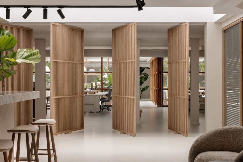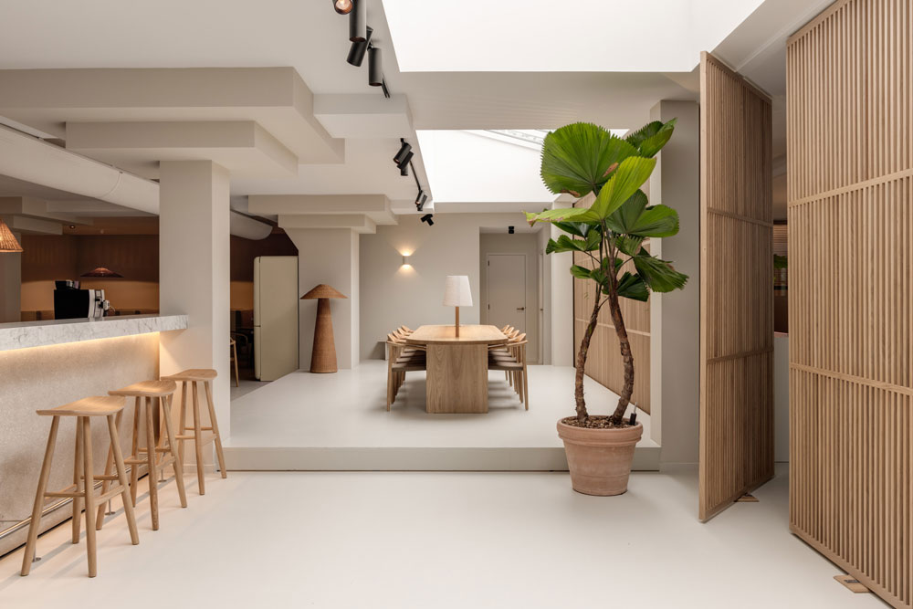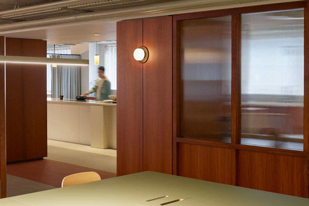 Prioritising adaptability, a bespoke timber screen-wall separates the social areas from more traditional office spaces, while still allowing for light to diffuse around the different zones. This slatted screen is divided into separate ‘doors’ that can be opened individually – each door can remain fully open, closed or rotated for varying levels of privacy, creating ‘corridors’ that flow into the space, once more perfect for hosting parties in an environment intended to function meaningfully beyond traditional office hours; the space facilitating the building of culture and community.