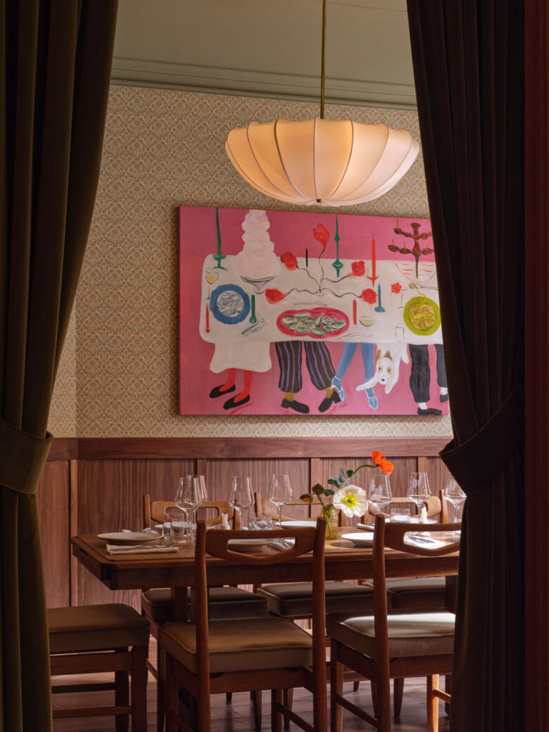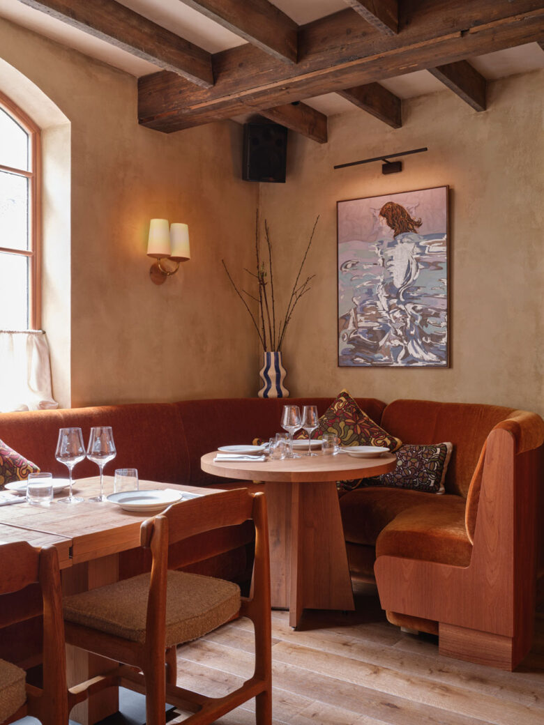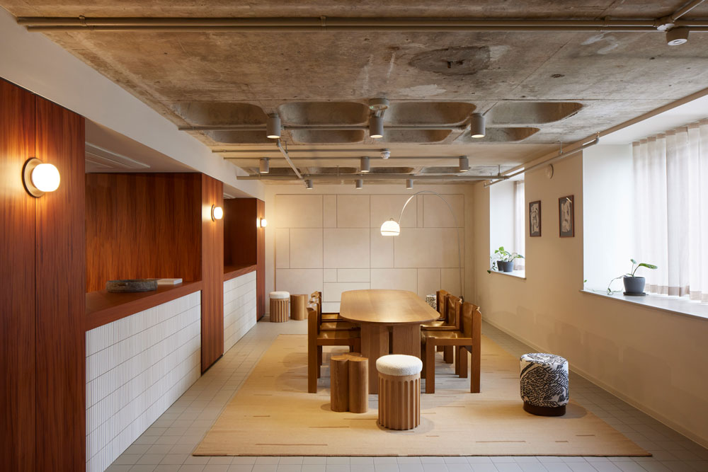 Striving to be as welcoming as a hotel but without the bedrooms, Hotel Rumour is a design-led hub for intimate drinks, lively music nights and private dinners. Studio Modijefsky made sure to retain the building’s existing wooden beams, high ceilings and grand arches, such as the converted attic space now used as the ‘Salone Royale’ – here, guests can find a spacious dining area boasting exposed wooden beams, a cosy gable roof, and a selection informal poufs, chairs, daybeds and tables.